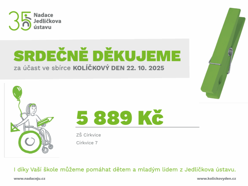Milí rodiče, žáci a přátelé školy, s obrovskou radostí oznamujeme, že v rámci naší charitativní sbírky Kolíčkový den se nám podařilo vybrat neuvěřitelných 5 889…